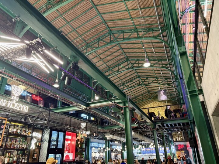 場所は、ワルシャワ市内の「Hala Koszyki(ハラ・コシュキ)」というフードコート。おしゃれなバーやカフェなどが集まるスポットで、楽しそうに飲んでいる人たちでにぎわっています。本当にここでパブリックビューイングがあるのだろうか? という雰囲気。