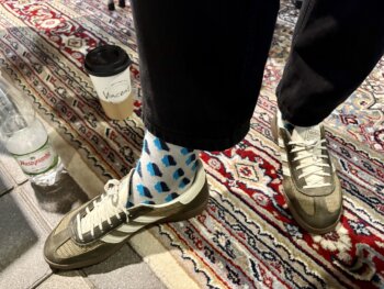 ちなみにお隣のカップルは、チケット争奪戦に敗れたから、少しでもイベント感を楽しみたいと思って初めて来たそう。普段から音楽好きなお二人は、感想を言い合いながら聴いて楽しんでいました。お姉さんはなんと、公式グッズの靴下を履いていました!