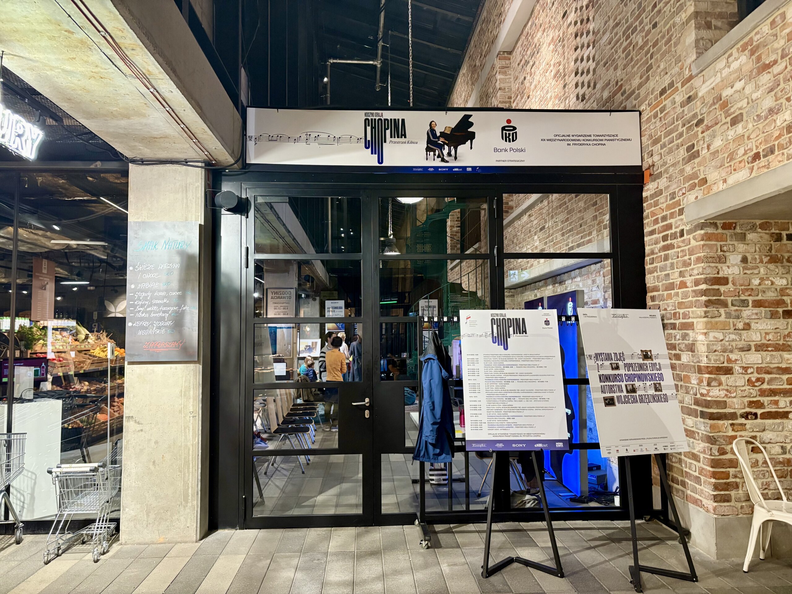 一応ショパンコンクールっぽい看板があるものの、どこにあるのかわからず、お酒を飲んでいる人々を横目にさまようこと数分……ピアノの音が聞こえてきました!