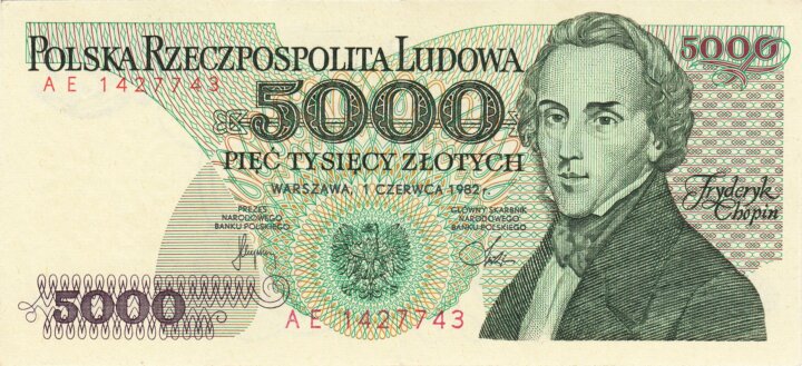 祖国を離れて生きたショパンは、ポーランドにとって“精神的な祖国”そのものでした。1982年に発行された5000ズウォティに選ばれました。ポロネーズやマズルカを書き続けた作曲家の肖像は、通貨の上で静かに国家の歴史と誇りを語りかけてきます。