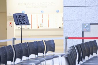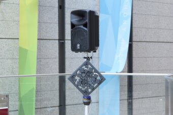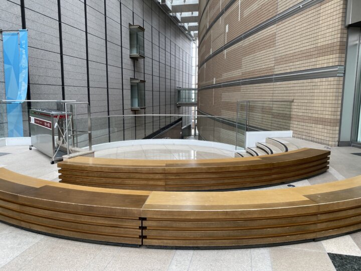 ミューザ川崎シンフォニーホールといえば、名だたる演奏家の方々がその音響を高評している日本屈指の人気ホールだ。そのエントランスにある「歓喜の広場」は、来場者や市民の憩いの場であり、サマーミューザの開幕ファンファーレも演奏される。ただ、ガラスに囲まれた広い吹き抜けの空間は響きやすく、ステージが円形ということもあり、どうしても音に焦点が生まれやすい構造だという。そうなれば音に過剰な響きが乗ってしまい、演奏者やお客さんにとって、演奏が聴きづらくなる場合も出てくるだろう。はたしてオトノハを設置することで、歓喜の広場の音響はどう変化するだろうか。