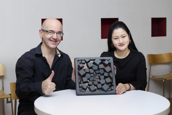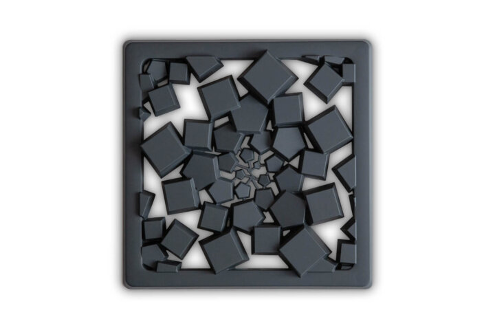「オトノハ」は、先述した一般的な音響パネル像とはかけ離れるものであった。まず、その大きさである。縦横の長さがそれぞれ30cmという小型サイズで、置く場所には困らなさそうだ。それに加え重量が約600gと、片手で楽々持ち運べる軽さなのもありがたい。そして特筆すべきは、そのデザイン。大小さまざまな多面体が散りばめられた外観は、一目見ただけで脳裏に焼き付くことであろう。