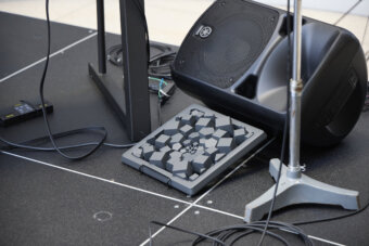 さて、それではオトノハの設置に移る。使用したオトノハの数は計10個。演奏されるお二人を囲むように5個、マイクと電子ピアノのモニタースピーカー3か所にそれぞれ1個ずつ、そして客席の横に2個だ。設置といっても、力仕事や複雑な取り付けは必要なく、ただ譜面台の上に置くかクランプで固定するだけ。これで準備完了である。