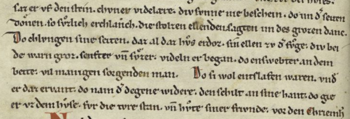 3行目に、該当箇所が見られます。(Do chlungen sine seiten daz al daz hůs erdoz sin ellen zu der fůge diu beide warn groz senfter und sůzer videln er began do enswebter an dem bette vil manigen sorgenden man.)