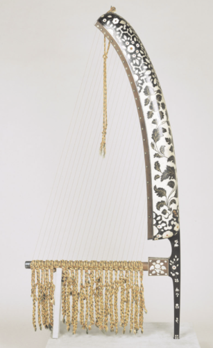 このように歴史の長いハープですが、なんと日本にも立ち寄っています。奈良・正倉院には、シルクロードを旅して唐へたどり着いた古代のハープ(箜篌、くご)が今も保存されています。残念ながら、その後の日本では定着せず、姿を消してしまいましたが、もし日本で人気を得ていたら雅楽にハープの親戚が混ざっていたかもしれなかったのです。