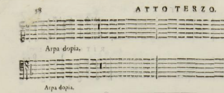 音楽史上、ハープが明確に役名を与えられて登場するのは、モンテヴェルディの歌劇《オルフェオ》(1607年)でしょう。楽器編成表には、arpa dopia(2列の弦をもつハープ)と名指しされ、重要な楽器の一つとして取り入れられました。