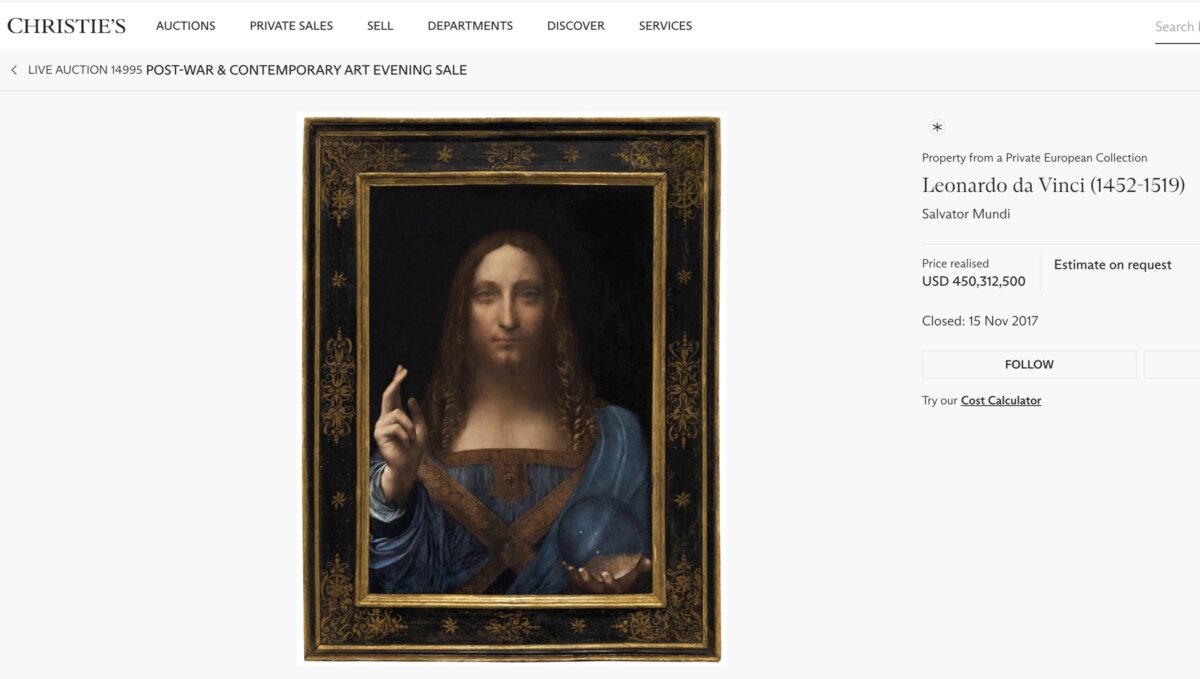 レオナルド・ダ・ヴィンチの油彩画としてのオークション出品が大きな話題になった《サルバトール・ムンディ》は、2017年にニューヨークのクリスティーズで落札された時に約4億5000万ドル、当時の日本円に換算して約510億円の値をつけた。それを聞いて「高すぎる」という感想をもった人もいれば、「有名な作家の絵だから、それくらいは当然だろうね」と思った人もいるだろう。