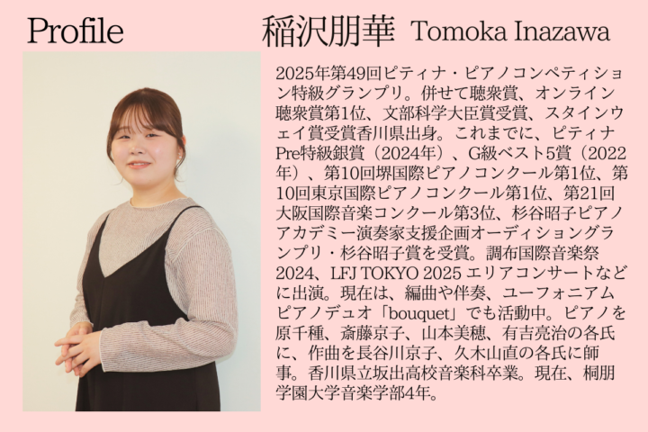 2004年生まれ。今年のピティナ特級グランプリに輝いた稲沢朋華さん。現在、桐朋学園大学音楽学部4年生。ピアニストとしての顔に加え、作曲や編曲、管楽器とのアンサンブルなど、多方面で才能を発揮。活き活きとエネルギーに満ちた様子は、その素顔からも感じとることができました。