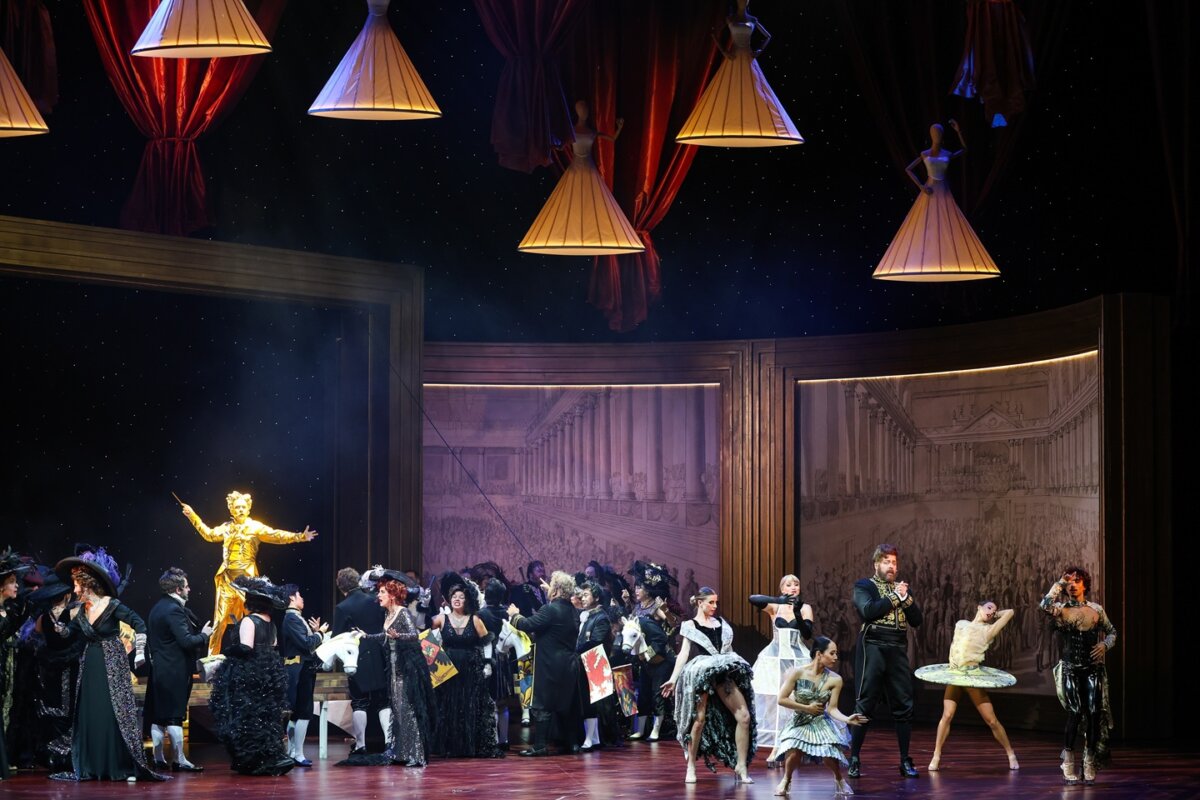 トーマス・エンツィンガーによる演出のもう一つの特色は、原作のウィーン会議に現代的なタッチを加え、欧州連合などへの風刺が随所に挿入されたこと。舞台(ウルリッヒ・ライトナー)と衣裳(ゲッツ・ランツェロット・フィッシャー)も二つの時代のバランスを取り、新たなものと昔ながらのウィーンらしさを両立させる細やかな心配りを見せてくれた。