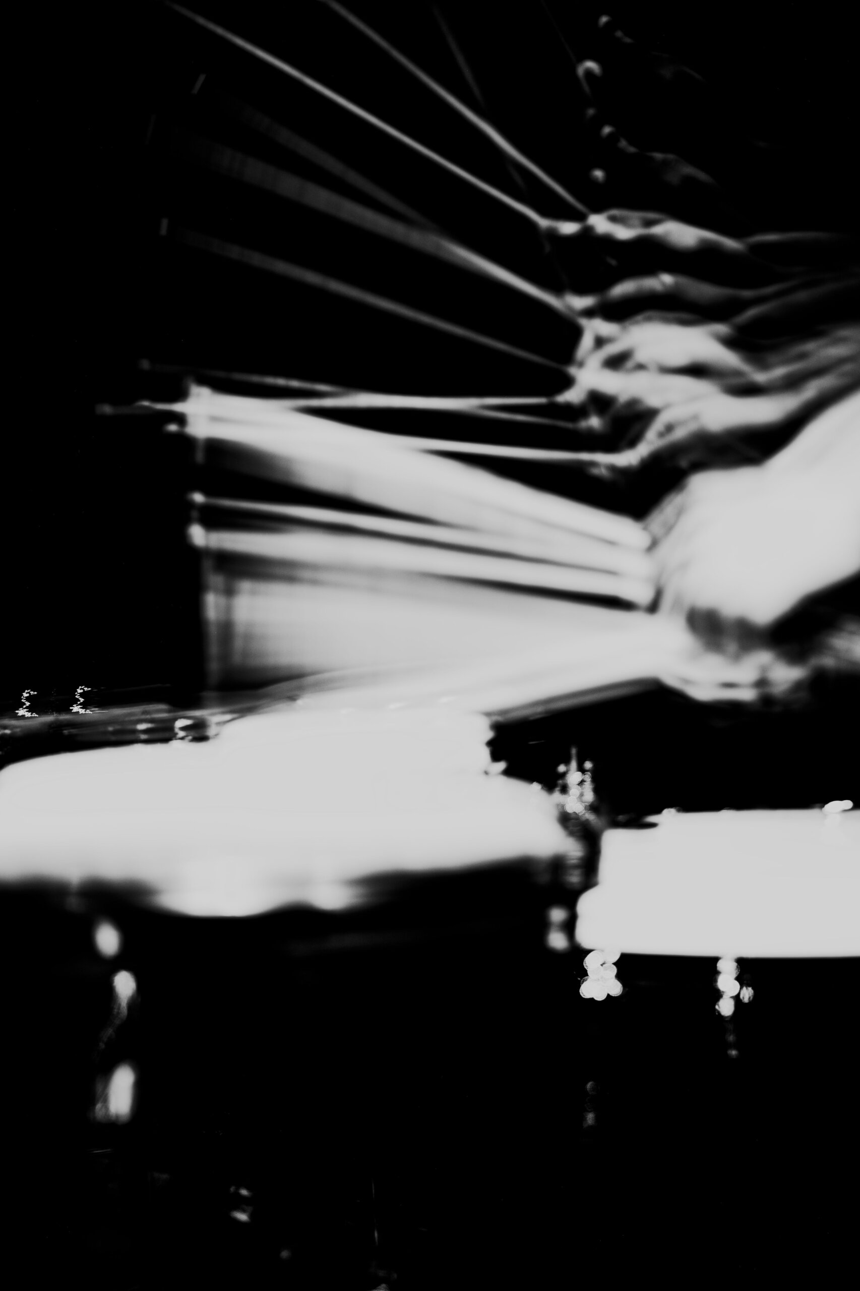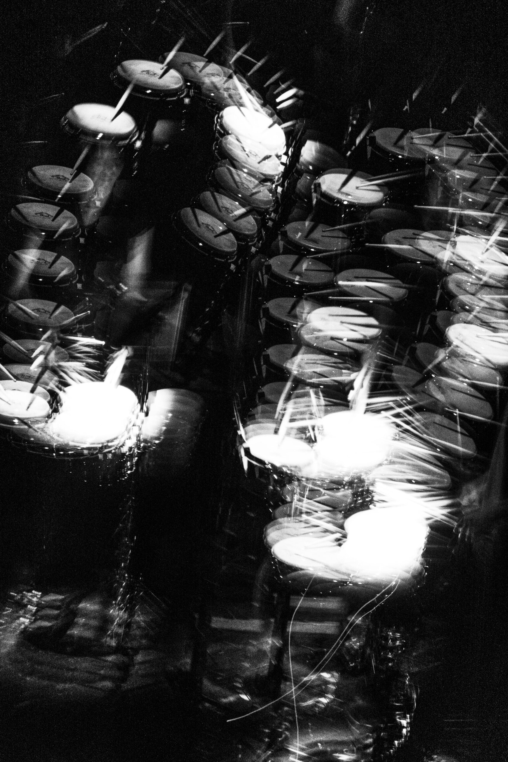 《Chronograffiti》は、打楽器トリオないし和太鼓ソロ、そして最小限の照明というミニマルな手段から、音響・視覚・身体振動を統合した驚異的な没入体験をつくり上げた。作曲は実験的バンド「goat」の主宰者として主に知られる日野浩志郎。2025年6月にドイツの「Moers Festival」で初演された作品を、「Black Chamber」(クリエイティブセンター大阪)の音響を前提に改訂したものである。第1曲〈Bongo Trio〉(ボンゴ三重奏)、第2曲〈Taiko Solo〉(和太鼓ソロ)、第3曲〈Loose Ends〉(三重奏:ボンゴ・コンガのセット×3)、第4曲〈Permutation〉(三重奏:ボンゴ・コンガ・タムのセット×3)から構成される。なお、第3曲は改訂に際して書き下ろされたもので、初演時の曲目であったスネア・デュオの作品を差し替えるかたちで追加された。ビジュアルエフェクトは古舘健。演奏はクラシック・現代音楽の打楽器奏者である谷口かんなと安藤巴、そして鼓童出身の前田剛史。異なるバックグラウンドをもつ奏者が共演する点も、本作の強度を支えている。