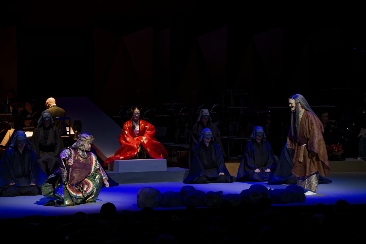 永遠の命を求め叶わぬ人間の姿を象徴的に描く能の難解さを少しでも緩和すべく、まずは萬斎と広上が舞台で解説。暗転するや、見えるのは指揮者、鷹姫、岩のみ。笛、小鼓、大鼓、太鼓が導入され、武満徹《弦楽のためのレクイエム》に被せてコロスが「泉は古く枯れ果てて」と情景を語りだすと、ホールは巨大な能舞台となる。上手の岩が動きだしたかのような大槻文藏の老人の登場を笛と鼓が静かにサポート、《弦楽のためのレクイエム》と重なりコロス歌唱が盛り上がる。野村裕基の若き王子空賦麟(くうふりん)が下手から出現。以下、現代能『鷹姫』が演じられる。