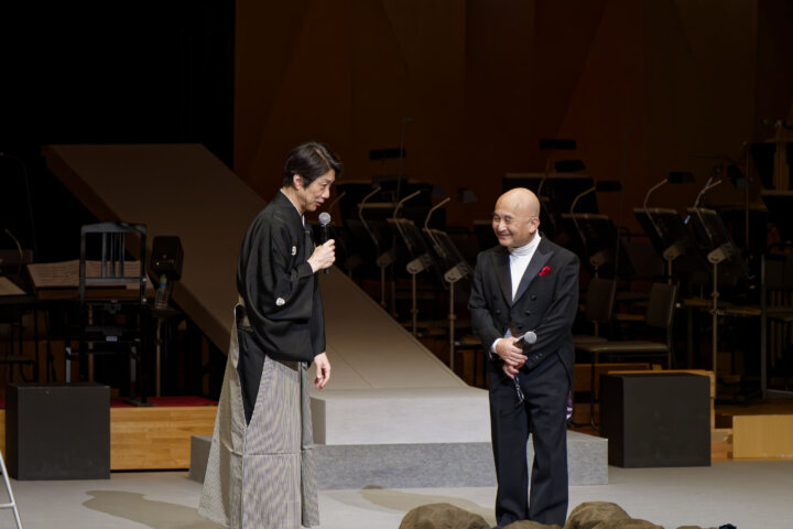 OEK側の責任者はアーティスティック・リーダー広上淳一。萬斎とは初の共同作業だが、去る8月末には大阪・関西万博での落合陽一×日本フィルプロジェクト「null²する音楽会」で野村万蔵らの狂言『田植』・能『野守』と日本フィル共演を成功に導いたばかり。満を持しての両巨頭がっぷり四つである。