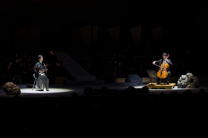 休憩後に舞台中央に出たOEKは、壮年期の西村朗がOEKのために書いた《鳥のヘテロフォニー》のケチャの盛り上がりに、前半で押さえたパワーを炸裂させた。つづき登場した萬斎が植木昭雄独奏の《瞑想》で朗読するイェイツ『湖の島イニスフリー』は、声とチェロの二重奏。前半に鷹姫とともに孤島で舞ったチェロの呟きを回想するかのよう。