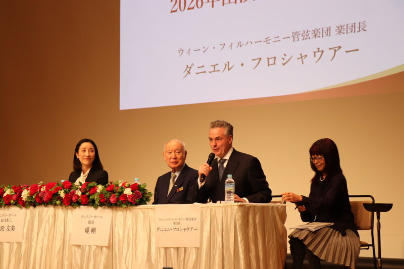 サントリーホールは2026年に開館40周年を迎える。その記念事業に関する記者会見が11月12日、堤 剛館長、長政友美総支配人、そして長年のパートナーであるウィーン・フィルハーモニー管弦楽団を代表して楽団長のダニエル・フロシャウアー氏が登壇し、サントリーホール ブルーローズ(小ホール)で開かれた。