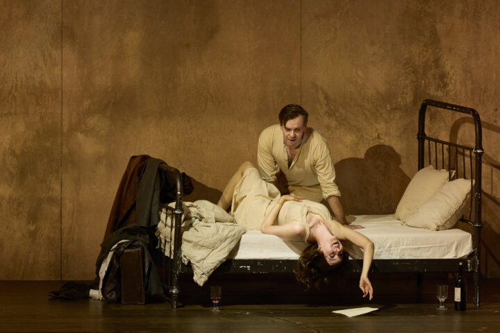 題名役を歌ったのはリセット・オロペサだ。この演出ではヴィッサーが「現代で言えば “ボーダーラインパーソナリティー症”」とマノンの性格を定義しているように、序曲の間に、きらびやかな社交界に憧れを抱く少女マノンが父親に冷たくあしらわれる様子を描いている。それによって病的な不安定さを持ったマノンを、2019年のキャストだったエルザ・ドライジクも上手に演じていたが、セクシャルな魔力は感じられず、地味な印象となった。その後ハンブルク州立歌劇場でドライジグが演じたマノンはハマり役だと思わせたので、演出との相性も重要だ。その点オロペーザはこのマノン像を輝かせ、不幸な心の翳りも表現した。二人の声もよく合い、愛を確認する二重唱では夢のように寄り添い、抗うデ・グリューに赦しと愛を懇願する二重唱は最高のドラマとなった。