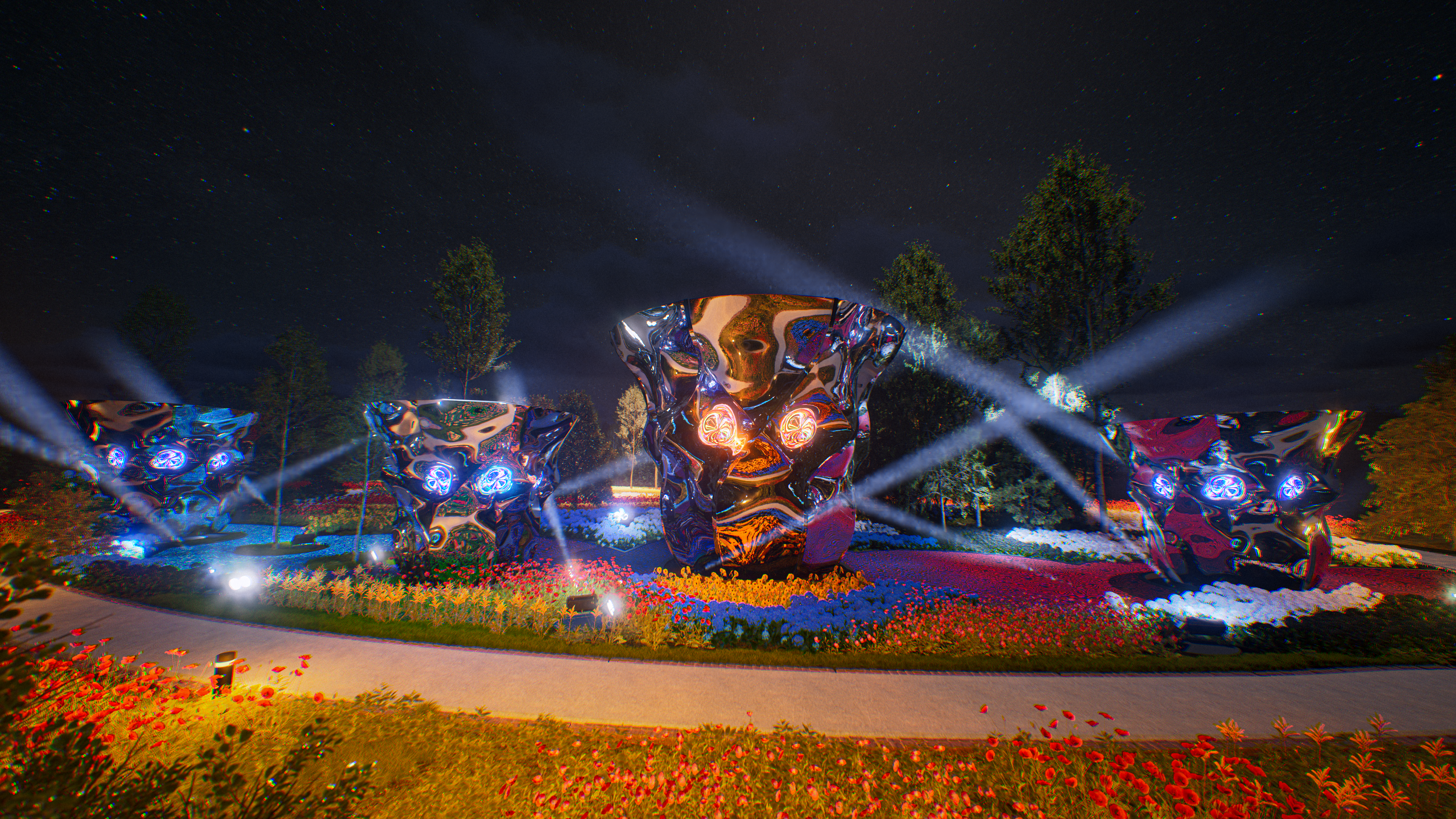 続く第2弾は、2027年3月に2027年国際園芸博覧会「GREEN × EXPO 2027」で公開される「null⁴(テトラヌル)」。「null⁴」は、「null²」が自然のなかで転生して生まれた風景変換彫刻となっており、花壇の花、空、風、来場者の影を回転する鏡面に取り込んで、風景を変換する。巨大なオブジェクトが回りながら、風景や光、人の気配を取り込み、場を生成していくのだそう。