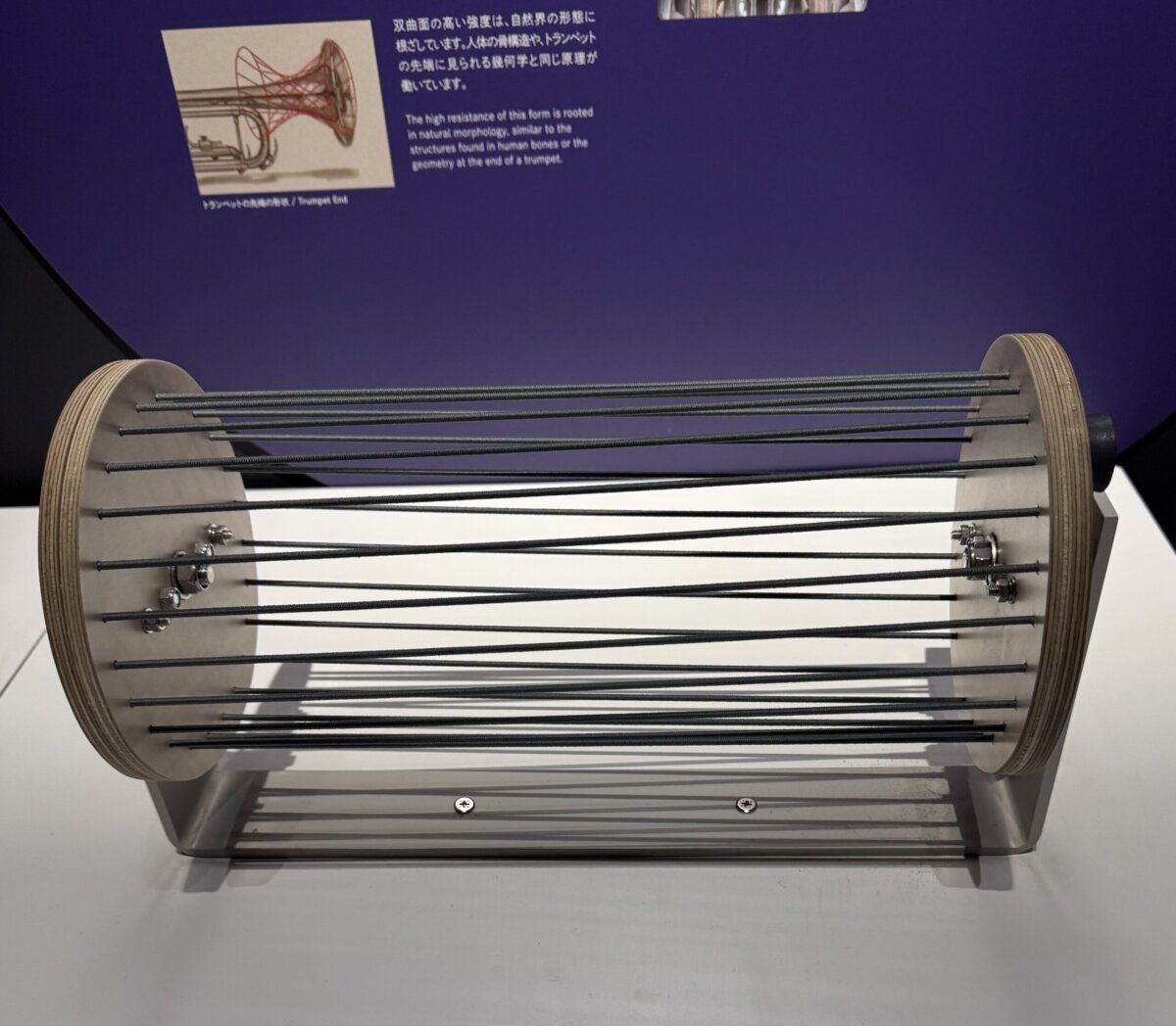 実は、この前の章の展示では小麦やニンニク、糸杉など植物に由来する魅力的な造形についての解説や模型展示があったのだが、この鼓型はあり方が根本的に違う。ロープは張り詰めたままなので、円盤を回転させても基本的に直線のままだ。しかし、回すことによって生じる円柱のくびれには、自然に円ができる。手で確かめる幾何学とでも言うべきだろうか。ひたすら美しい。トランペットの音が出るラッパの部分に見られる曲面も同じとの解説があった。