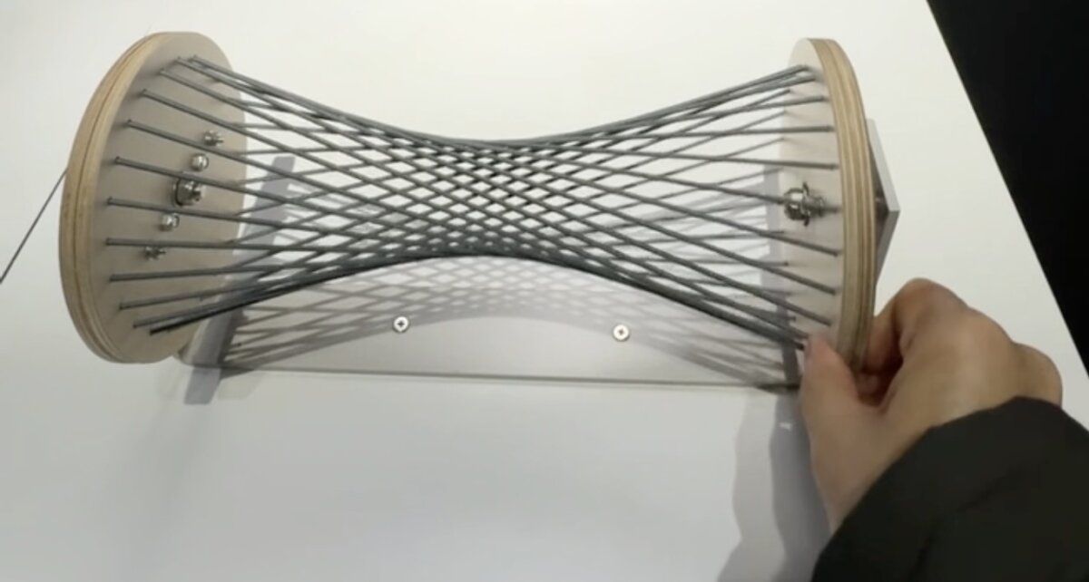 おそらく読者にも想像はついているのではないかと思うが、これは、ガウディの建築原理を体験するためにNAKEDが用意したツールだ。鼓のような形は、サグラダ・ファミリアの建物の中で実際に使われているという。中に入って天の方向を見上げると、その曲面が見える、あるいは、存在が感じられるはずだ。