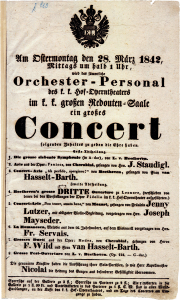 それは昨年[1841年]の初めのことだった。当地の芸術状況について話していた芸術愛好家の面々が、宮廷歌劇場の音楽監督であるオットー・ニコライ氏(現在のフィルハーモニー・コンサートの監督兼首席指揮者)に、ウィーンで最大かつ最良の楽団である彼のオーケストラを起用して、大規模な音楽会を開くことを提案した。それによって我らの大音楽家たちの傑作をふさわしい形で演奏するとともに、楽団員に定収入を与えようというのである。ニコライ氏はこの発案を真摯に受け止め、オーケストラにその内容を会合の場で伝えた——こうしてこの企画は立ち上がったのである。活動的で思慮深い楽長[ニコライのこと]が監督に選ばれたが、最初の公演の成功は、この人選の妥当性を証明した。
