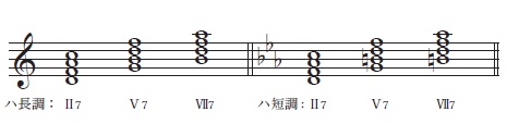 ハ短調:Ⅱ7→減五短七の和音、Ⅴ7→属七の和音、Ⅶ7→減七の和音