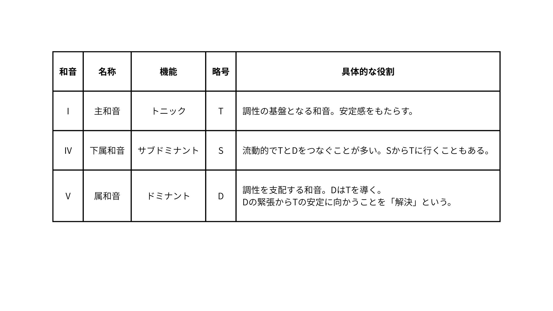 それぞれの和音には調性の中での固有の役割「機能」があります。とくに重要であるⅠ、 Ⅳ、 Ⅴを主要三和音といいます。