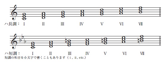 ハ長調:Ⅰ→長三和音、Ⅱ→短三和音、Ⅲ→短三和音、Ⅳ→長三和音、Ⅴ→長三和音、Ⅵ→短三和音、Ⅶ→減三和音