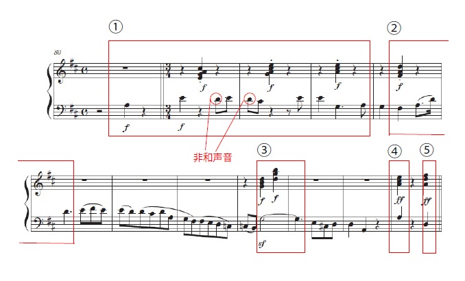 ① Ⅴ7/D/属七の和音、②Ⅰ/ T/長三和音、③Ⅳ/S/長三和音、④Ⅴ/D/長三和音、⑤Ⅰ/T/長三和音
